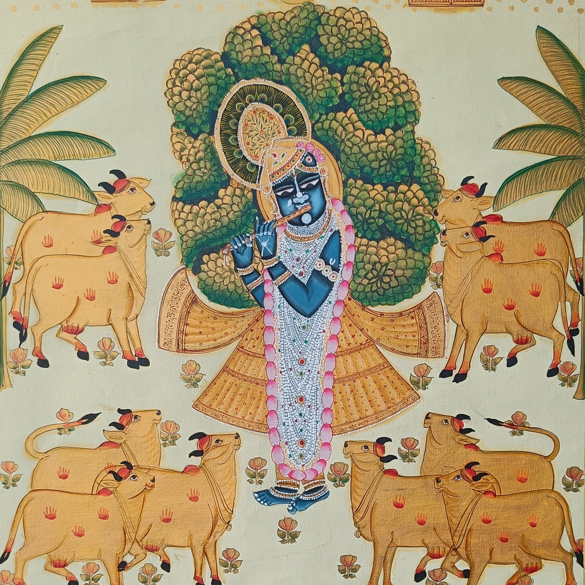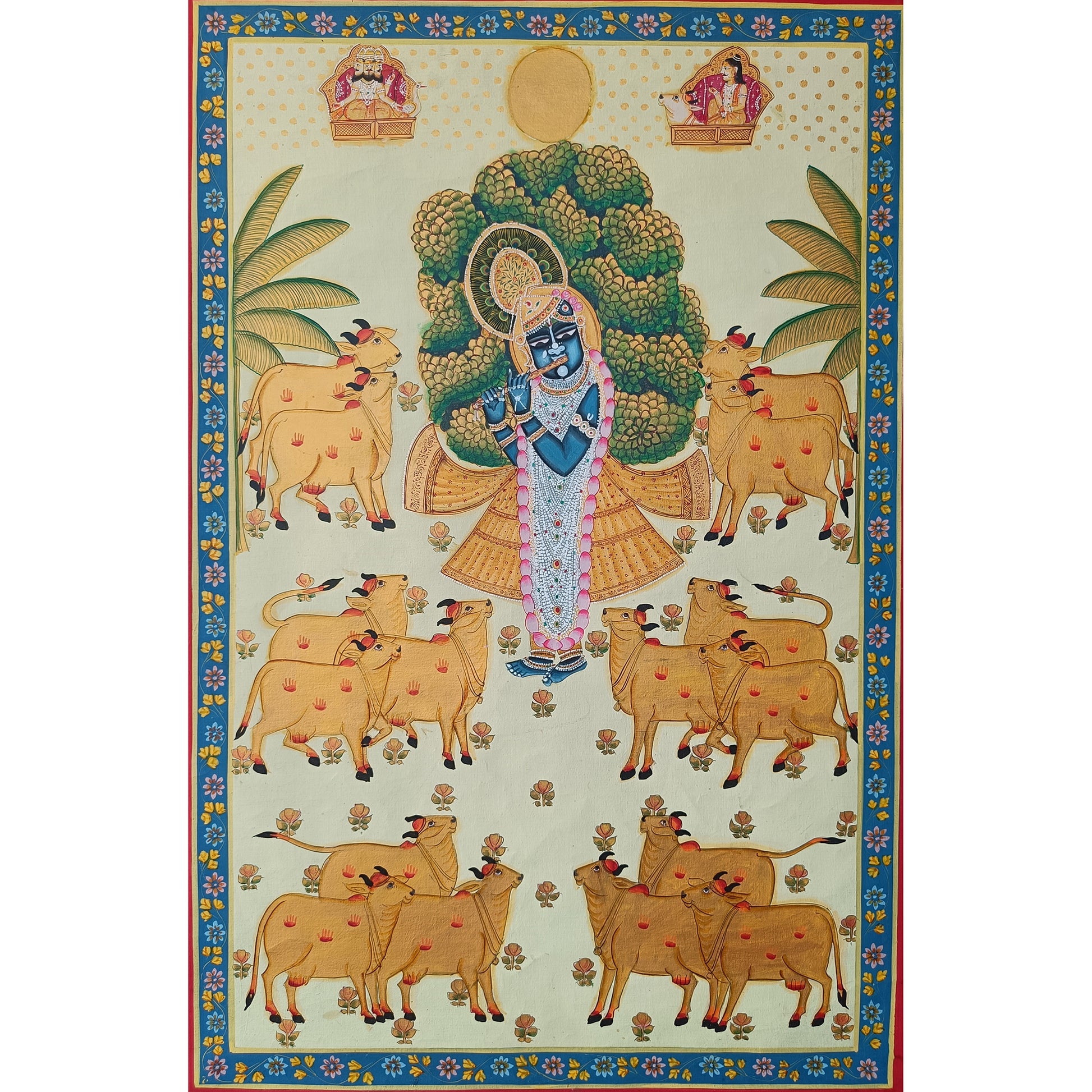 Krishna with Cows – Hand-Painted Pichwai on Cloth