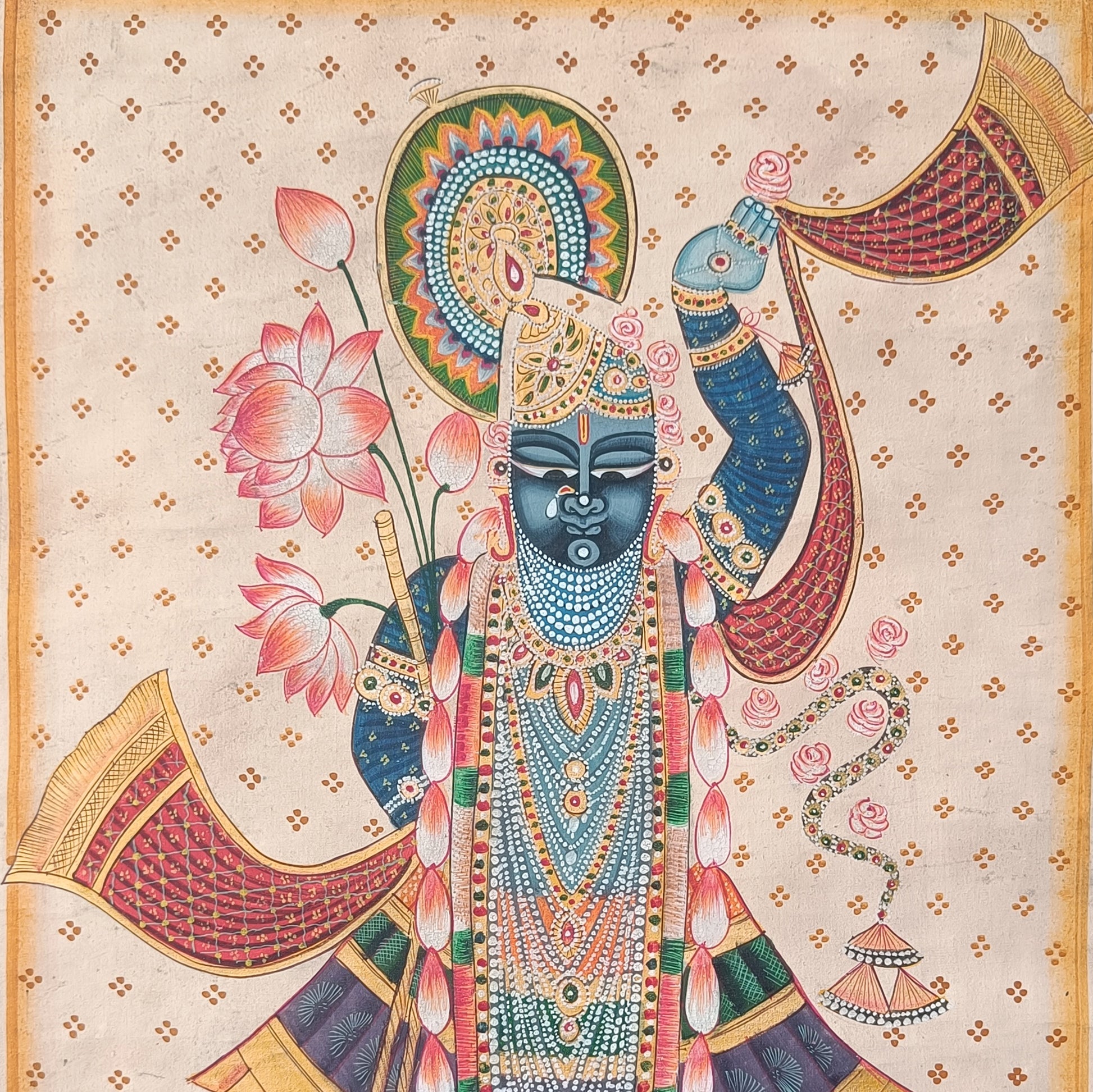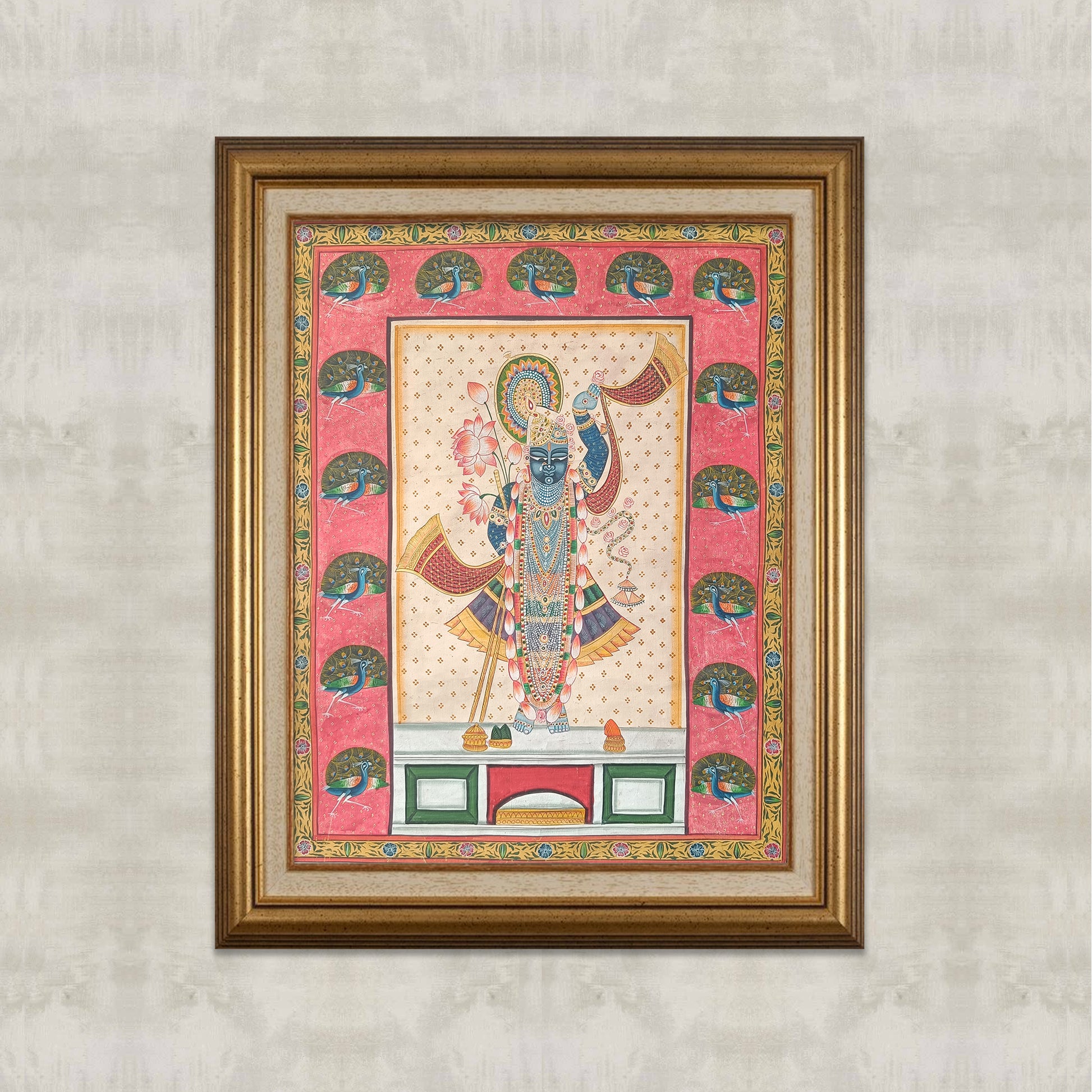 This artwork showcases Shrinathji in all his divine glory, surrounded by peacock motifs symbolizing beauty and grace. The rich, traditional design adds a regal touch to any space, making it a perfect addition for those who appreciate timeless Indian art.