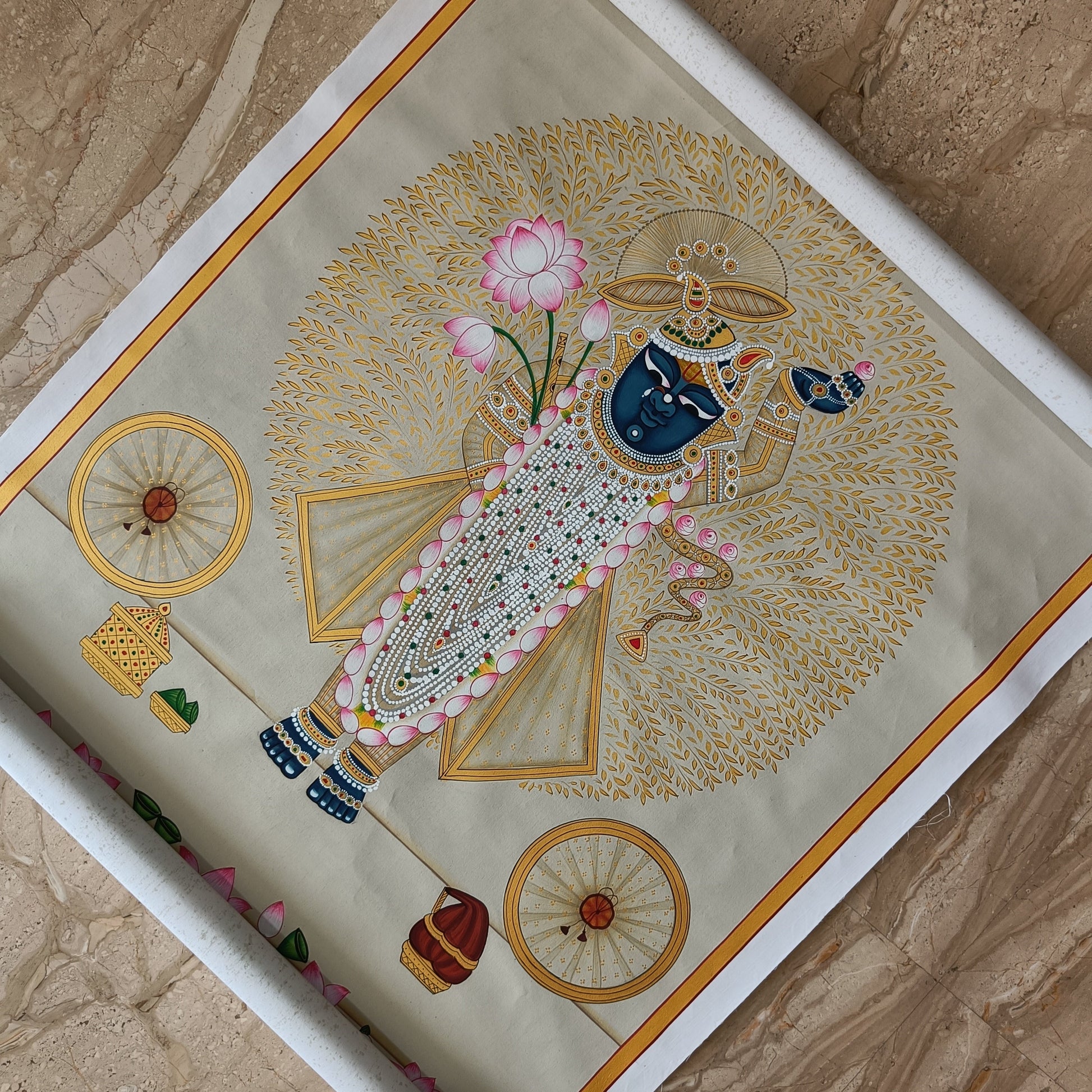 This Shrinathji Tree of Life Pichwai brings a quiet sense of grace to any space. Hand-painted in a soft white and gold palette, it captures the serene presence of Lord Shrinathji with delicate detailing and thoughtful symbolism.